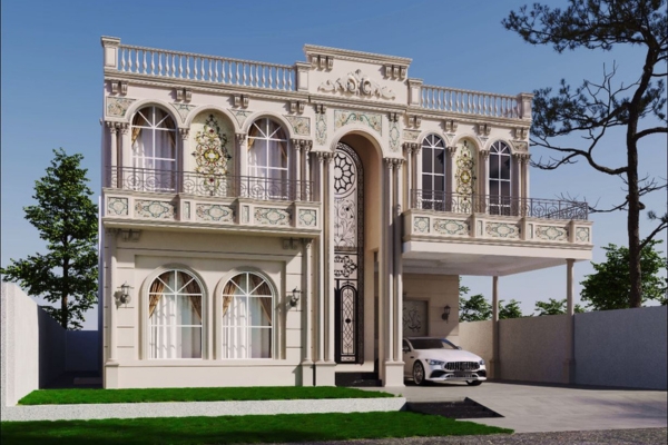 The front elevation design features clean lines, minimalistic geometry, and soft color tones that reflect sophistication and timelessness. This modern elevation for 5 Marla house adds value to your property while enhancing its street appeal.